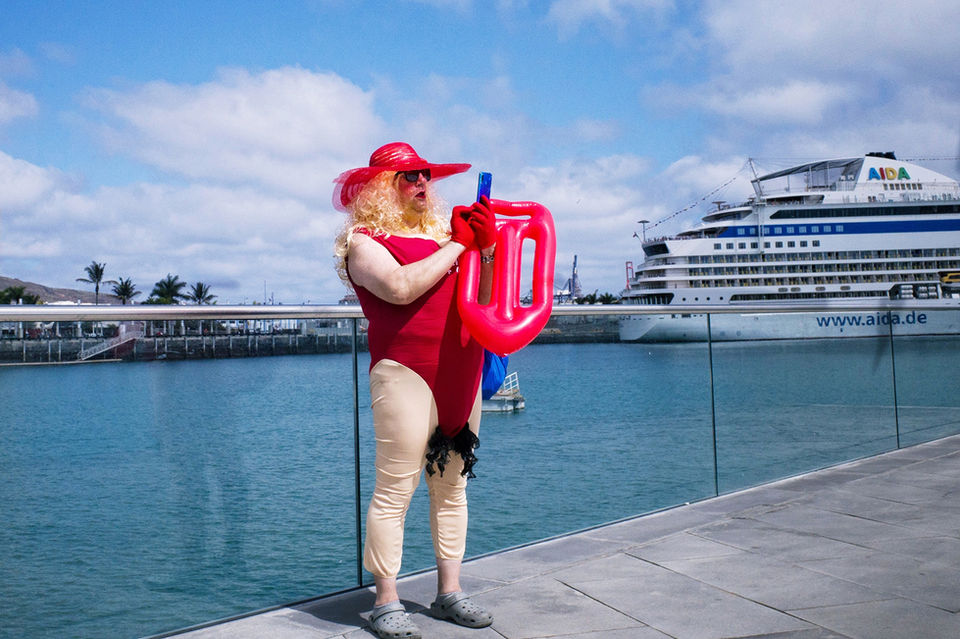 La ciudad sigue latiendo, y el carnaval, como la fotografía, captura su pulso por un instante antes de desvanecerse en el tiempo. La miradas de Marilyn y Audrey, atrapadas en unos vestidos, son testigos del desfile de máscaras. El viajero de una guagua parece ir en bicicleta. Más allá, el paisaje canario despliega su belleza austera, indiferente al bullicio, recordando que, tras la fiesta, la isla sigue siendo la misma: luz, mar y horizonte.
