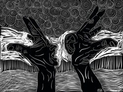 Intento imaginarme cómo fue el día que el artista decide dibujar con su dedo, tal vez pensó que los pinceles estaban demasiado duros para lavarlos, o quizás en el último intento de hacerse unos mates con el polvillo del final del paquete desistió y trazó siluetas sobre la mesa con un poco de agua verdosa teñida por la yerba, o simplemente un día divagó con la idea que antes de señalar algo con el dedo lo mejor es dibujarlo.