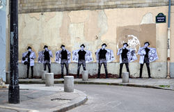 Charles Leval, llamado Levalet, es un artista visual francés que hizo sus estudios de arte en Estrasburgo y se sirve de las calles de París desde 2012 para colocar sus obras de Street Art, un arte reconocido ya por el mundo de la cultura como un movimiento. Combinando sus conocimientos de teatro y de pintura con un buen ojo topográfico, produce escenas específicas muy personales para cada lugar, unas iconografías pintadas en papel con tinta china. En éstas habla de lo que hace posible su trabajo, de su fondo artístico, de la legalidad de hacer arte en los espacios públicos de la ciudad. La mayoría de las veces las representaciones -que rayan lo absurdo y que no están carentes de poesía ni de crítica social- se basan en situaciones inspiradas en la vida cotidiana y siempre fuera de sincronía con el contexto, pero estableciendo cierto diálogo visual y semántico con él. Puestas en escena lúdicas que interactúan y se funden con el transeúnte para crear escenografías compartidas únicas, dramatizaciones que conviven en armonía con las del mundo real. Quién sabe si en un futuro no muy lejano las salas de arte serán las propias calles; hoy por hoy es el sueño de Levalet.