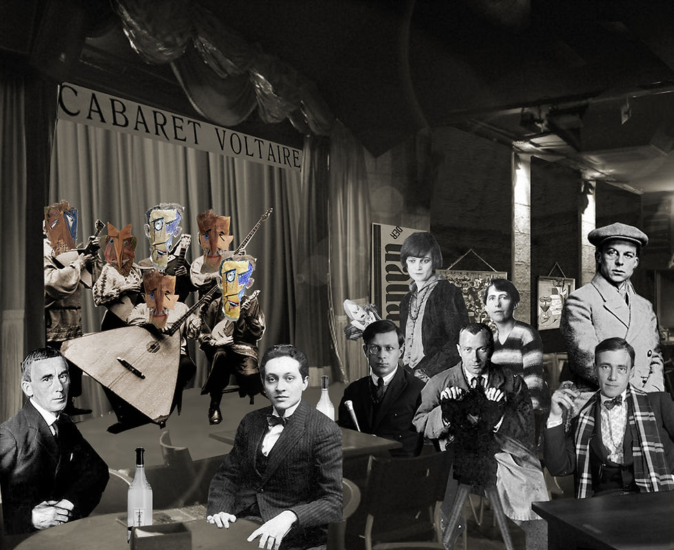 Zurich, febrero de 1916. Orquesta de balalaikas con máscaras de Marcel Janco ensayan para la función de la noche del Cabaret Voltaire mientras los dadaístas se toman unos vinos.